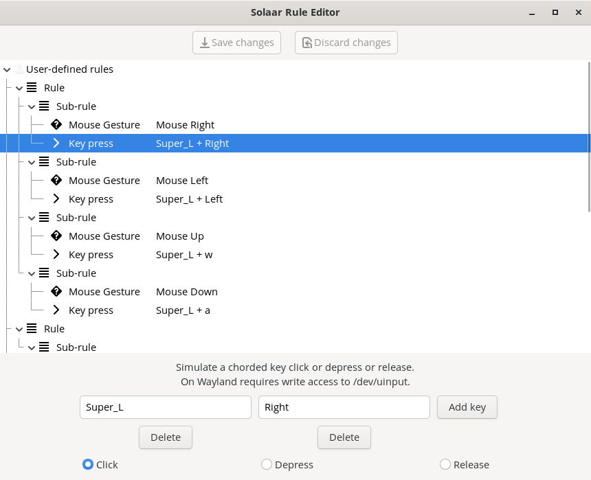~/.config/solaar/rules.yamlfile. - Example config which enables mouse gestures in each direction and forward/back buttons for copying and pasting.
